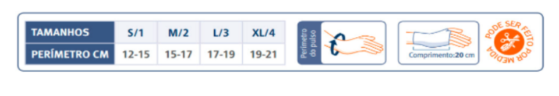 Fabricado com material elástico suave, com fechos velcro, tala flexível palmar removível e tala de polegar flexível moldável.